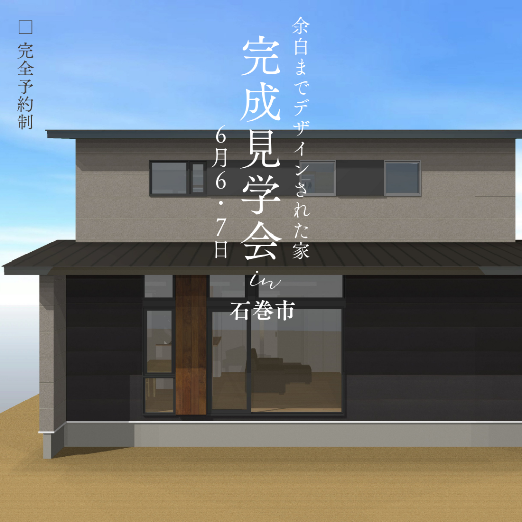 2026年6月6日(土)~6月7日(日)の2日間、石巻市に建設中のGX志向型住宅(ZEH水準を超える長期的に光熱費を大幅に削減できる省エネ住宅)M様邸の「住宅完成内覧会」(完全予約制)をお施主様のご厚意により開催させて頂きます。詳細につきましては後日またお知らせいたします。
