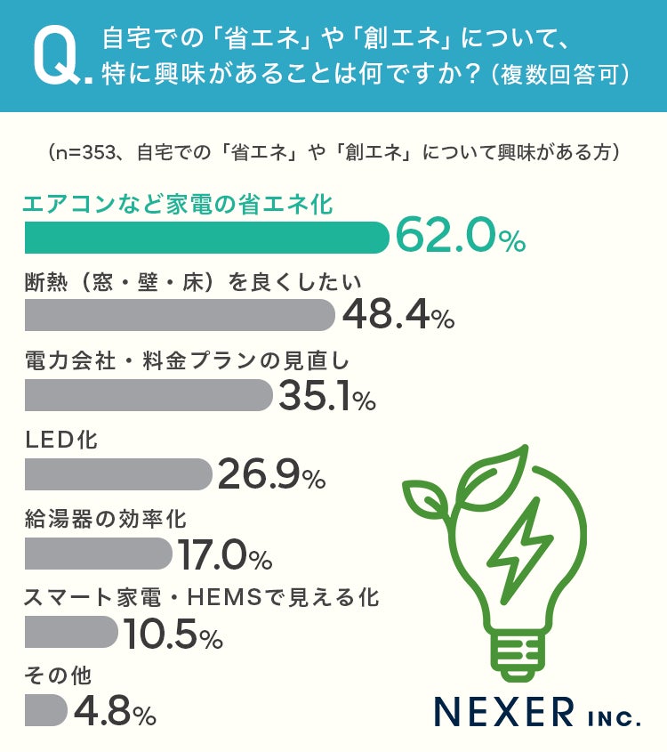 続いて、自宅での「省エネ」や「創エネ」について興味がある方に、特に興味がある取り組みを聞いてみました。