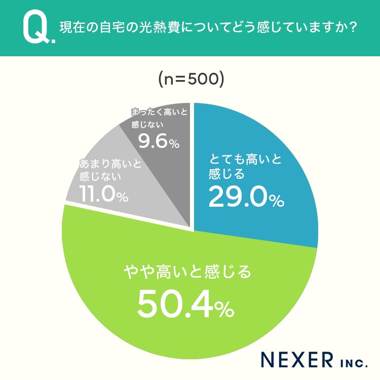 その結果「とても高いと感じる」が29.0%、「やや高いと感じる」が50.4%で、合わせて79.4%の人が光熱費を「高い」と感じていることがわかりました。一方「あまり高いと感じない」は11.0%、「まったく高いと感じない」は9.6%にとどまりました。