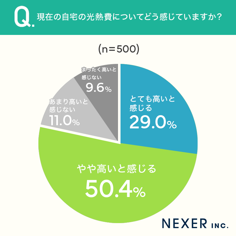 その結果「とても高いと感じる」が29.0%、「やや高いと感じる」が50.4%で、合わせて79.4%の人が光熱費を「高い」と感じていることがわかりました。一方「あまり高いと感じない」は11.0%、「まったく高いと感じない」は9.6%にとどまりました。